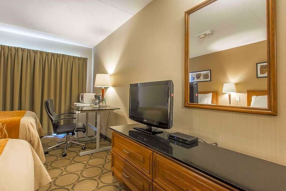 Room enjoys a coffee maker, ironing boards, iron and a TV with cable channels. A hairdryer can be found in the bathroom.